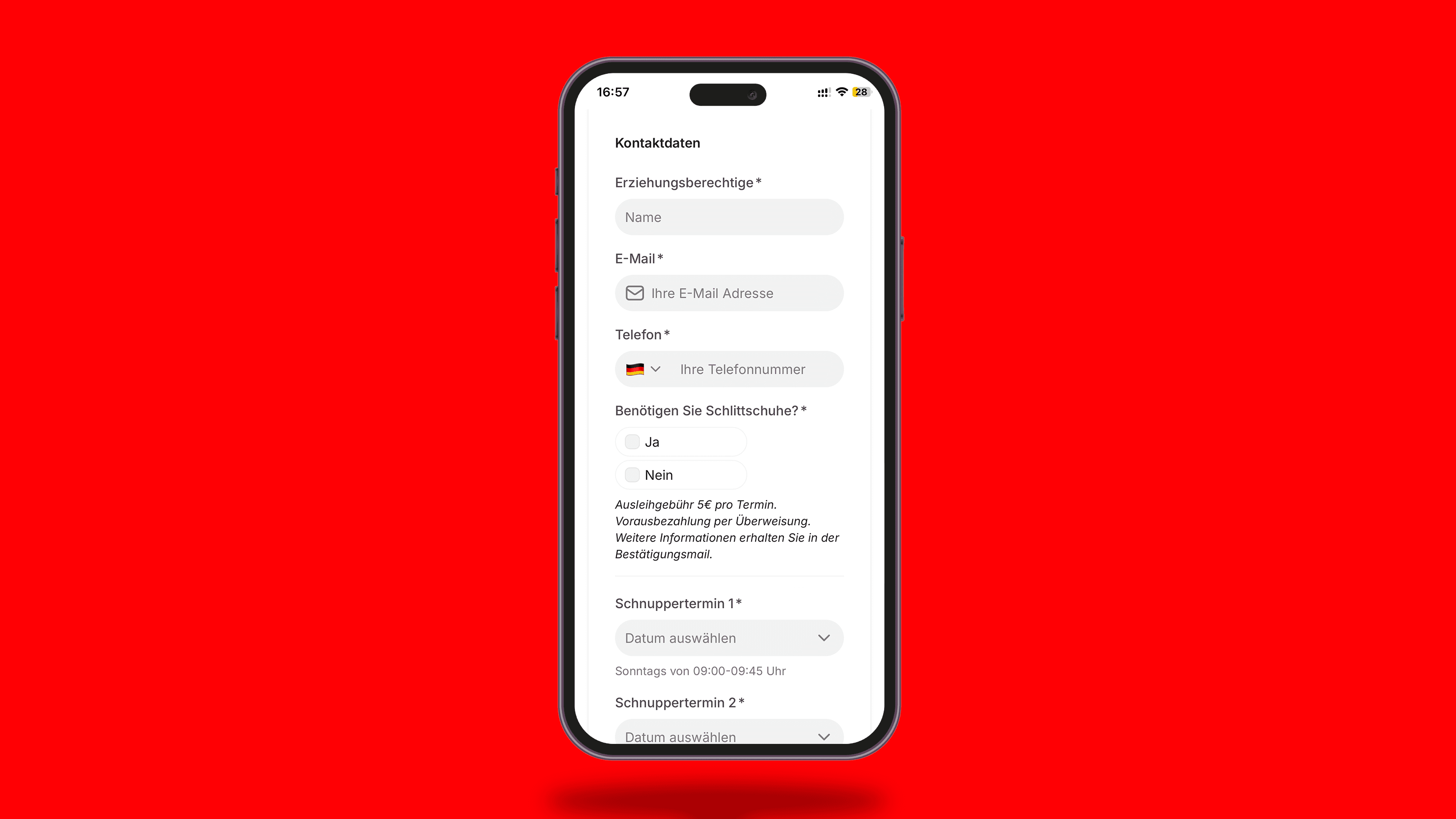 Durch die neu entwickelte Landingpage konnte der organisatorische Aufwand für die ehrenamtlichen Mitarbeitenden deutlich reduziert werden. Interessenten geben nun alle relevanten Informationen direkt im Anmeldeformular ein, das sich dynamisch anpasst – beispielsweise werden zusätzliche Felder angezeigt, wenn Schlittschuhe benötigt werden, inklusive Größenangabe. Auch das Alter wird berücksichtigt, sodass automatisch die passenden Kinder- oder Erwachsenenkurse angezeigt werden.