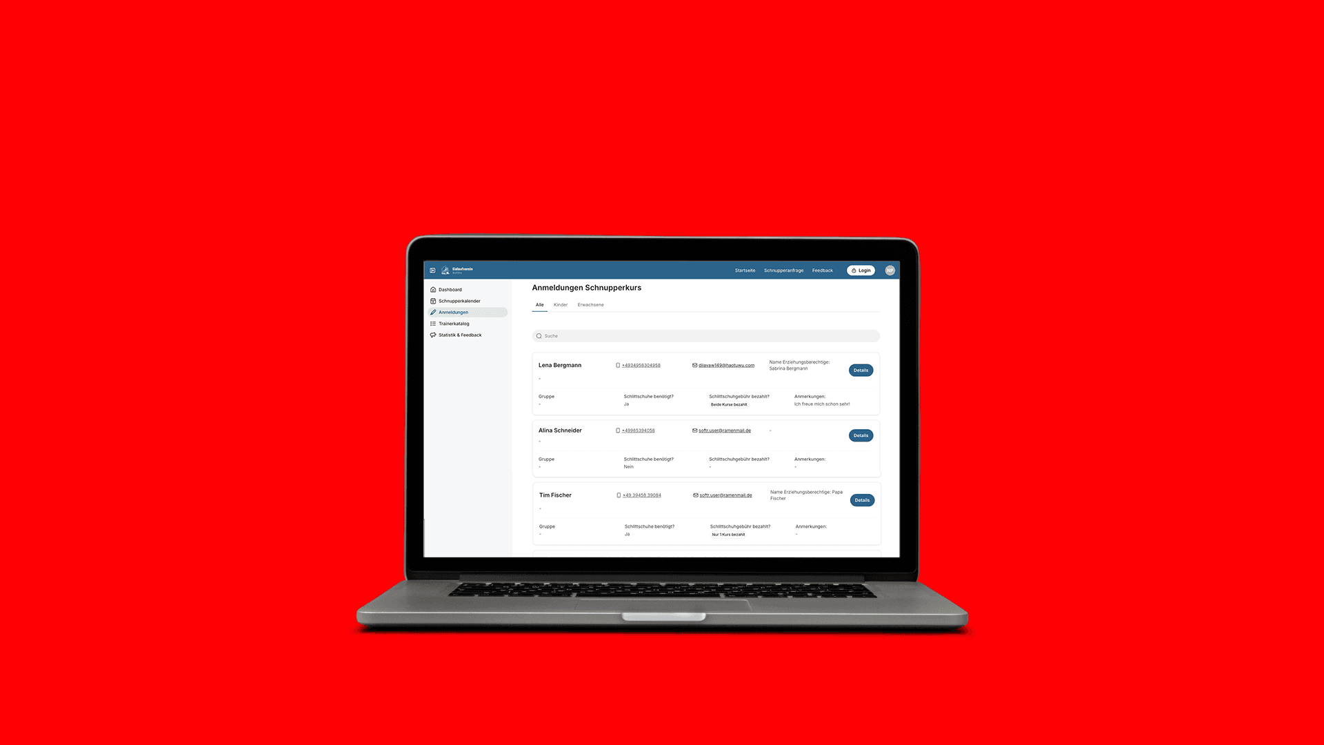 Im internen Login-Bereich können die Mitarbeitenden jederzeit einsehen, welche Personen sich zu welchen Kursen angemeldet haben, welcher Trainer die jeweiligen Kurse betreut und welche individuellen Daten zu den Teilnehmenden vorliegen. Dadurch entsteht eine zentrale, transparente und zeitsparende Verwaltungsbasis.